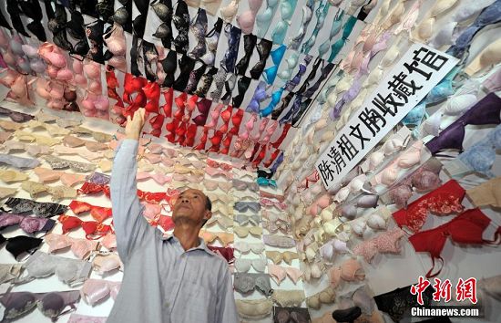 [國(guó)內(nèi)新聞]4月21日,海南省三亞市崖城鎮(zhèn)的陳清祖花費(fèi)20年時(shí)間收集5000余件文胸,在一間棟不起眼小房間的墻壁上、天花板上掛滿(mǎn)了各式各樣的女性文胸,數(shù)量多達(dá)5000余件,而這些令人目不暇接的“藏品”來(lái)自全國(guó)30多所高校的女生。據(jù)陳清祖介紹,他的夢(mèng)想是將來(lái)打造一間文胸收藏館,通過(guò)展示內(nèi)衣,提高全社會(huì)對(duì)女性乳房健康的關(guān)注度。圖為陳清祖展示他的“特別藏品”。