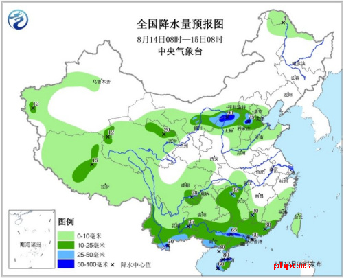 圖2 全國降水量預報圖(8月13日08時—14日08時)