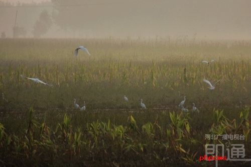 連日來(lái),一群約有40只的白鷺棲息在邯鄲廣平縣東張孟鄉(xiāng)附近的一片玉米田地里。