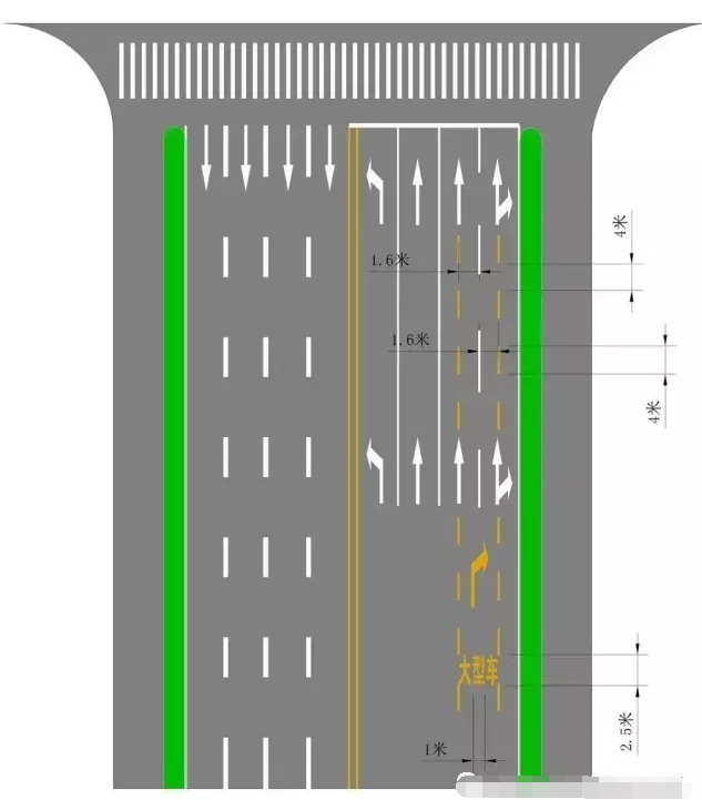 將公交車等大型車右轉的車道向道路中心移動半個車道(此處樹枝高度已達到公交車等大型車通行要求),右側第一與第二條存儲車道中間用黃虛線施劃專供大型車右轉的車道,并施劃右轉箭頭(見示意圖);將右側第一條右轉車道改為直加右車道,右側第二條直加右車道改為直行車道,同時配套修改車道指示標志。