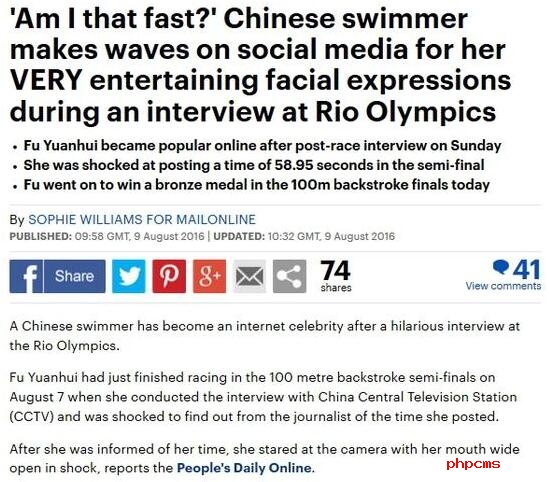 而對(duì)于傅園慧的搞笑采訪,《每日郵報(bào)》也做了簡(jiǎn)單的介紹,但是對(duì)于傅園慧那句極具中國(guó)特色的“我已經(jīng)用了洪荒之力了!”《每日郵報(bào)》的翻譯非常普通,相對(duì)于博大精深的中文表達(dá),英國(guó)媒體顯然已經(jīng)找不到合適的語句來翻譯傅園慧的“洪荒之力”。