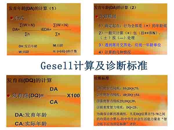 格賽爾(Gesell)智能診斷法適用于嬰幼兒。這種方法 從動作能、應物能、言語能及應人能4個方面進行檢查,并把4周、16周、28周、40周、52周、18個月、24個月、36個月作為8個“樞紐年齡”,即 在這些階段顯示出特殊飛躍進展。所測得的結(jié)果,以發(fā)育商數(shù)(DQ)來表示。